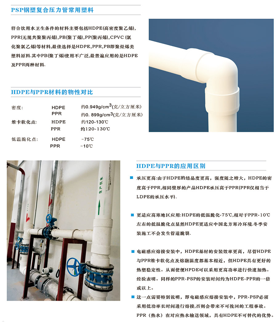 采用電磁感應加熱熔接型雙熱熔管件,接口部位的可靠性 大適用于公共建筑、住宅供水管道,尤其適合高層建筑物 的上下水系統。 由于采用架空敷設,理論上必須采用剛性管材,盡管管材 產品種類繁多,適合建筑架空敷設剛性管特性的一般認為 只有:銅管、不銹鋼管、襯塑鋼管、鋼塑復合壓力管,也 還有鋁合金襯塑管等小眾產品。其中銅管由于價格昂貴及 資源稀缺顯然不是可以大規模應用的產品;不銹鋼管是理 想選擇之一;而襯塑鋼管端口一定程度與介質接觸,外層 鋼則完全裸露,容易污染介質同時容易銹蝕,同時鋼塑分 離的問題不可避免,實際上衛生性甚至不如普通鋼管; 相對而言,PSP鋼塑復合壓力管并配合國恒塑業的連接方 式(電磁熔接+專用雙熱熔管件)兼具鋼管的剛性及塑料管 本身的衛生性。是主流產品中性價比高的一款產品。